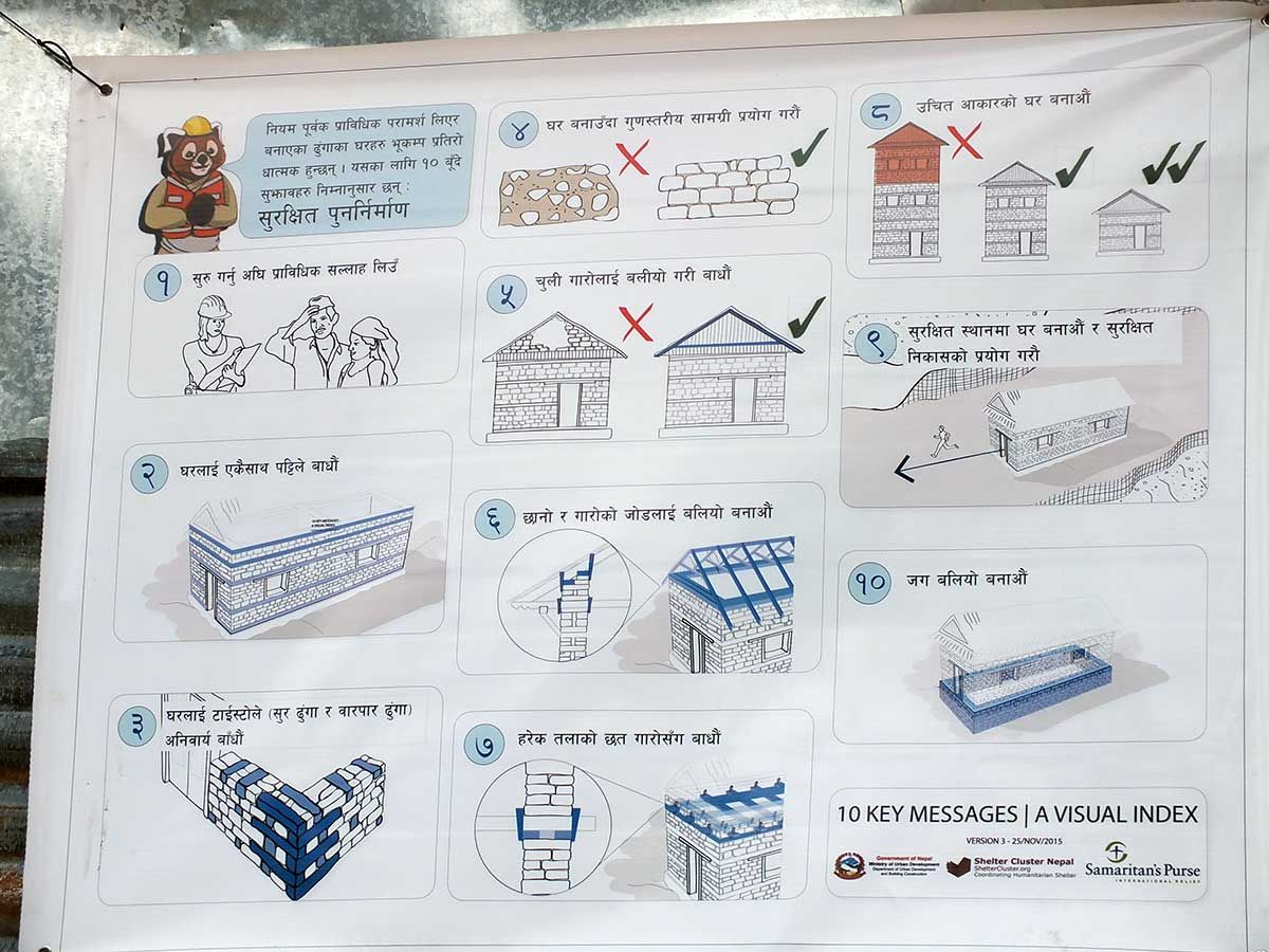 Die Menschen die das Beben überlebten, haben überwiegend Ihre Grundstücke verloren und dort auch keine Chance auf einen Wiederaufbau. Das Dorf muß daher ganz neu an anderer Stelle wieder aufgebaut werden. Um auch mit einfachen Mitteln die Erdbebensicherheit der Gebäude zu verbessern werden Anleitungen verteilt, deren Berücksichtigung mit finanzieller Unterstützung durch die Regierung honoriert wird. bauanleitung Da dieser Ort eine wichtige Etappe auf der üblichen Trekking-Route vieler Reiseanbieter ist, kann das Trekking-Gewerbe im ganzen Tal davon ab, dass auch hier wieder ausreichend Unterkünfte zur Verfügung stehen. Dieses Nadelöhr muß zunächst geöffnet werden, um im ganzen Tal wieder steigende Einnahmen zu ermöglichen. Zwei Häuser wurden bereits von Schweizer Helfern neu gebaut und müssen nun noch ausgestattet werden, um wieder Gäste beherbergen zu können. Im Umfeld soll das neue Dorfzentrum entstehen.